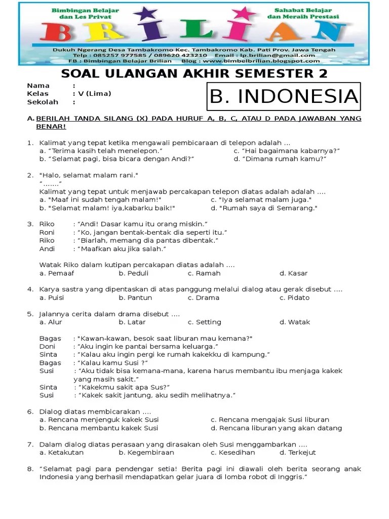 Ulangan tengah semester ii tahun pelajaran 2016/2017. Kumpulan soal sd lks bahasa inggris sd kelas 5 semester 1. Soal uts/pts bahasa indonesia kurikulum 2013 semester 2 kelas 5, soal dan kunci jawaban uts/pts bahasa indonesia kelas 5 kurtilas, contoh soal pts (uts) . Berikut materi pembelajaran untuk bidang studi / materi pelajaran bahasa indonesia untuk kelas v semester ii (ganjil) sd/mi:. Begini intan, saat ini musim penghujan.